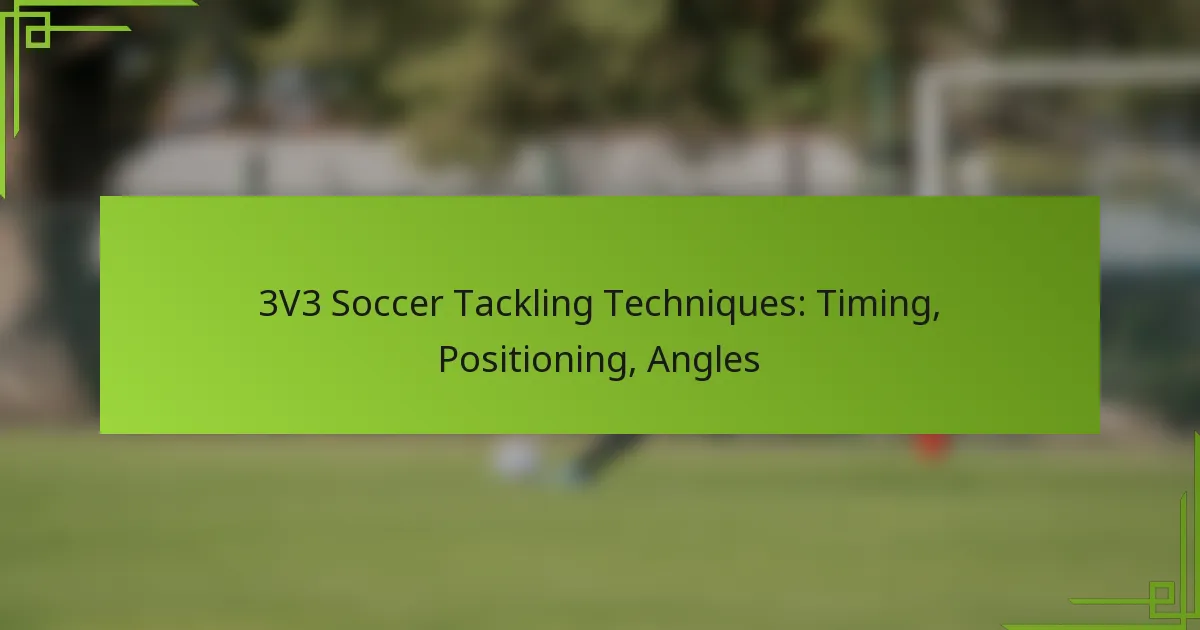 Key tackling techniques in 3v3 soccer include timing, positioning, and utilizing angles effectively. Mastering these elements can significantly enhance a player’s ability to regain possession and disrupt the opponent’s play.